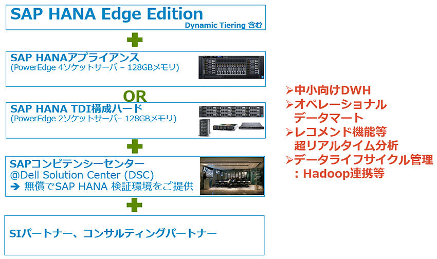今後、SAP HANAの廉価版の「Edge Edition」向けに、SAP HANAアプライアンスだけではなく、よりスモールスタートに適した超高速のサーバをSAP HANAのTDI(テーラードデータセンター統合)構成に沿ったかたちで様々な2ソケットサーバをベースに提供していく計画です。