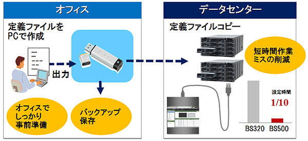 まず、1つ目の「導入・設定」では「事前定義ファイル」を使って、お客さまのオフィスで装置の導入前にシャーシ設定の準備ができるようになっています。データセンターのサーバルーム内で、単調な初期設定を延々と行うようなことはなく、現場ではUSBメモリーを本体に挿入し、定義ファイルをコピーしていくだけ。シャーシ初期設定の作業時間が、BS320の場合より約10分の1にまで短縮する上に、人的ミスによるトラブルも削減できるようになりました。