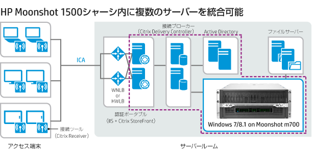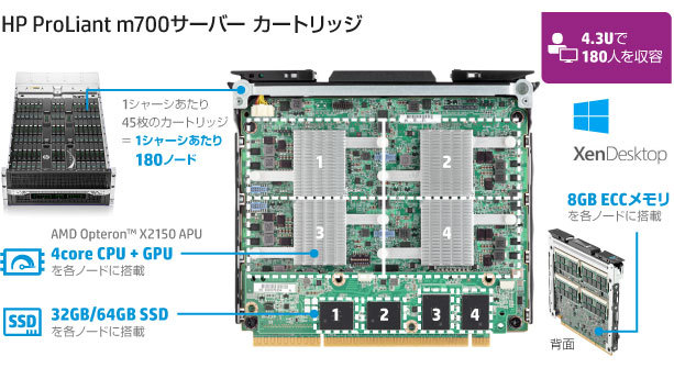もうひとつ重要なポイントがあります。本格的なデスクトップ仮想化基盤を構築するには、併用するソフトウェアの「管理サーバー」を構築するケースがありますが、HP Moonshot Systemではシャーシ内に管理用のサーバーカートリッジを搭載することができます。HP Moonshot Systemの1ボックスの中に、150~160ユーザー分の高性能なリモートデスクトップ環境と管理サーバー、認証サーバー、接続ブローカーなどを統合することができるのです。