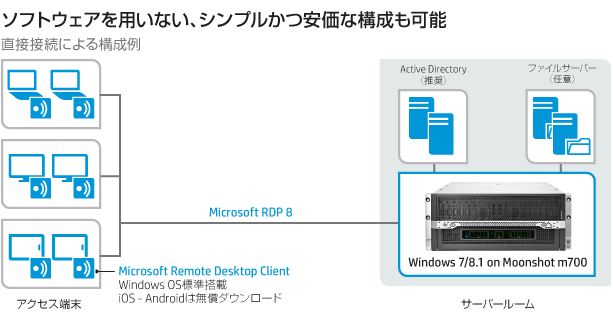 また、より一層のコスト削減が必要な場合、Windowsの標準機能である「リモートデスクトップ接続」を使って、直接HP Moonshot Systemとアクセス端末を接続する方法も選べます。接続ブローカーなどのソフトウェアを介さないシンプルな構成です。物理環境であるHDIならではの構成ですが、接続や運用を手動で行う必要がありますのでトレードオフを十分に考慮することをおすすめします。