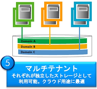 そして第5が「マルチテナント」。3PAR内部の領域を論理的に階層化し、各テナントに占有させ権限も与える機能。例えば、メールやトランザクションを管理するワークロード、動画を作成・再生するワークロード、ファイルの構造化を行うワークロードなど、Active Directoryなど認証システムと連携させながらより多くのサービスとストレージを一元管理することができる。