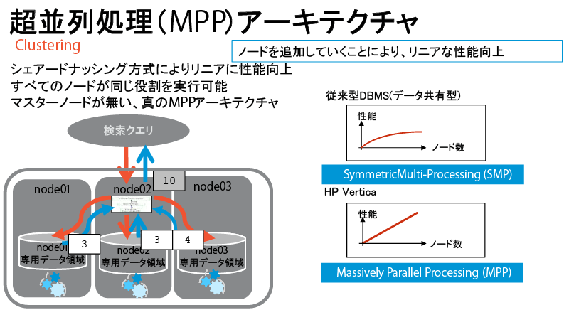 もうひとつのポイントは、柔軟な拡張性だ。一般的なDWHアプライアンスは、分析処理の高速化を目的にハードウェアとソフトウェアを独自のアーキテクチャに基づいてパッケージングしている。そのため、高いパフォーマンスは得られるものの、全体でのコストも高くなりがちである。Verticaは一般的なx86アーキテクチャ上のOSで動くソフトウェアとして提供される。そのため、必要なパフォーマンスに応じて、リーズナブルなx86サーバを用意し、その上にインストールすることで環境を構築できる。さらに、VerticaはMPP(Massively Parallel Processing)アーキテクチャに対応しており、将来的により高いパフォーマンスが必要になった際には、標準的なx86サーバをクラスタに追加していくことで容易なスケールアウトを可能にしている。導入や将来的なパフォーマンスアップにかかるコストをより抑えることができるというわけだ。