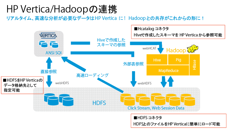 HP Verticaは、データ分析用途に特化したDBソフトウェアだ。開発元であったVerticaを、HPが2011年に買収。翌年には統合を完了して、同社のビッグデータソリューションの一部とした。