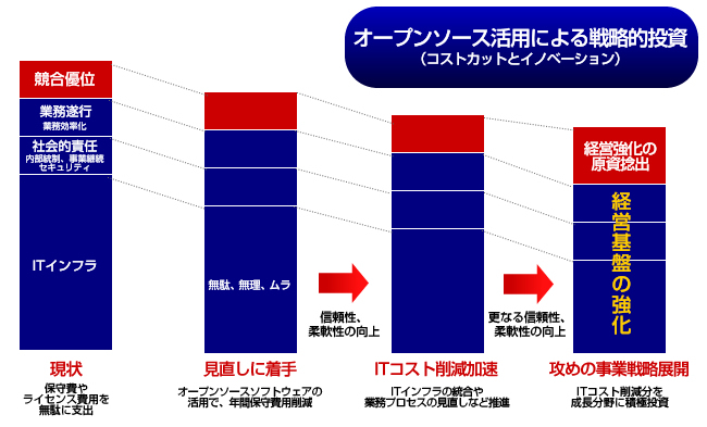 このOSSワンストップソリューションをベースとして、SIOSではJBossを活用したコスト削減にも力を入れている。OSSを活用したインフラの構築のみならず、アプリケーション開発の部分でも長年に渡って蓄積してきた豊富なJavaプログラミングのノウハウを活かして対応できるという。2009年のJBoss採用例では、「より高度なアプリケーションを実現して競合優位を確立したい。ただし、コストは削減したい」というユーザー企業の要望を受け、アプリケーション・サーバにJBoss、そしてデータベースサーバには、SIOSが国内展開をすすめているPostgres Plusを採用し、高度なアプリケーションを実装してサービス・レベルを向上させた新システムがまもなくカットオーバーを迎えるという。不況下だからこそ、コスト削減とシステム機能の向上を同時に実現することが求められるが、OSSに関する経験が豊富なSIOSだからこそ、長期的な視点でコスト削減を実現しつつ、優れたサービスを実現することで競合他社に対して優位に立てるITシステムを実現できるといえる。不況を脱して再び経済が上向きになったタイミングを逃さずに業績拡大を実現するには、不況のさなかである現時点でどれだけ効率的なIT投資を行なえるのかが重要だろう。
