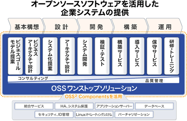 サイオステクノロジー(SIOS)は、“Software for Innovative Open Solutions”の頭文字を社名に掲げることからも分かるとおり、1997年の創業以来一貫してLinuxやJavaといったオープンな技術に取り組んできた。最近ではエンドユーザー企業に対して直接SIサービスを提供することにも力を入れている。従来のOSSを使ったSIサービスでは、どうしても製品ごとに専門家が立つような状況であり、ユーザー企業側の視点で全体を眺め渡した上で最適化を行なえる人材は不足していた。これは、OSSの進化が急速なせいで全てを把握できる人材を育てるのが容易ではなかったという理由もあるが、経験の蓄積に加えてOSS自体が成熟してきたこともあり、SIOSでは新たに「OSSワンストップソリューション」の提供を開始した。製品カットで縦割りに構成されていた組織から、横断的な情報共有が可能な体制に改めた結果、ユーザー企業に専任で割り当てられるプロジェクト・マネージャーがあらゆるOSS製品に関してユーザーの要望を聞き、基本設計から構築、ヘルプデスクまでを提供することが可能になったという。現時点でこうした体制を実現できるSI事業者は少ないのだが、いち早くこうした取り組みが実現できたのはOSSに関する豊富な経験があってのことだろう。