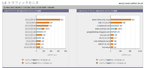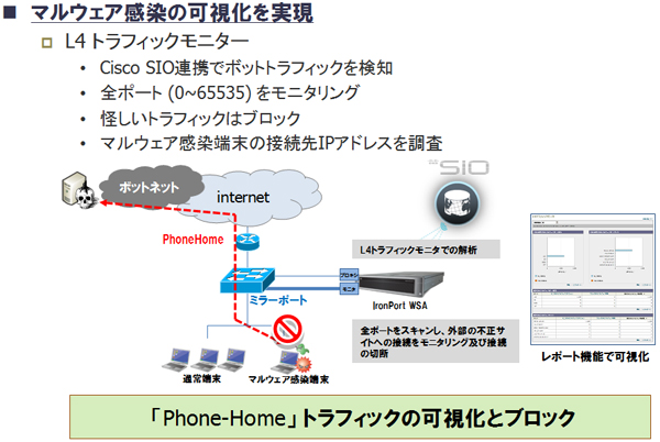しかし、ゼロデイ攻撃や未知のマルウェアといった脅威を複合的に利用する「新しいタイプの攻撃」に対しては、これらの対策を実施したからといって100%の防御が保証されるわけではない。IronPort WSAでは、万が一これらの対策をかいくぐって社内のシステムがマルウェアに感染してしまった場合に有効な「L4トラフィックモニタ」機能を搭載している。