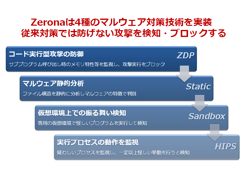 Zerona Z4では、コード実行型攻撃の検知や防御を行う「ZDP」と呼ばれるエンジン(Z1に搭載)に加え、マルウェアの静的な分析を行う「Static」、疑わしいプログラムをシステム上に構築した仮想環境上で実行してマルウェアかどうかの検知を行える「Sandbox」、実行プロセスの動作を監視して怪しい挙動をブロックする「HIPS」と呼ばれる、より高精度な検知エンジンを利用できる。既存の環境にZ1を導入し、その後必要に応じてZ4へと移行するといった運用も可能だ。