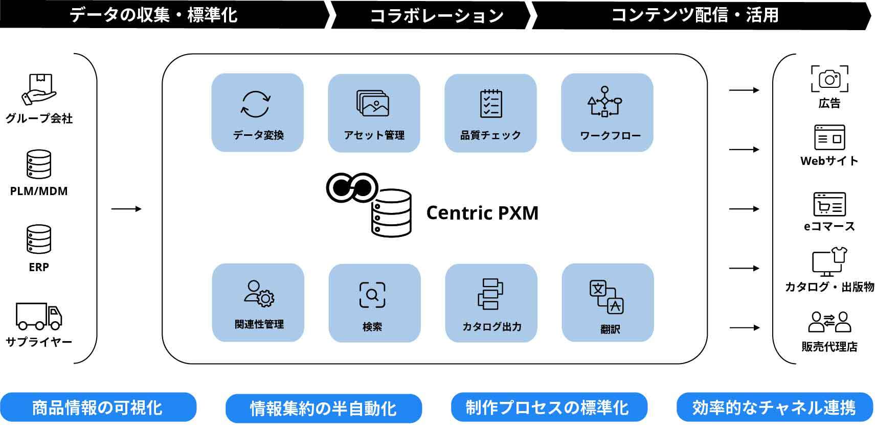Centric PXMプラットフォームでは、複数のデータ管理機能を提供することで、商品情報・デジタルアセットの収集管理の効率化、データメンテナンスの負荷軽減、コンテンツ制作の効率化、商品の公開リードタイムの短縮を実現します。