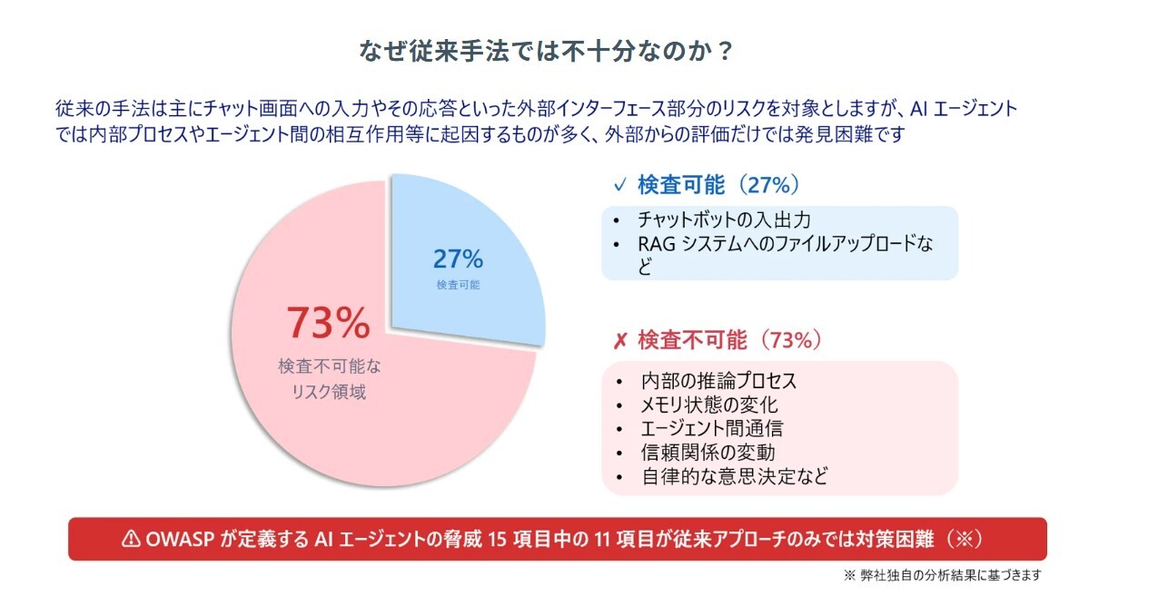AI エージェントの内部プロセスや複雑な相互作用に起因するリスクを適切に評価するには、 設計書レベルでの検討が不可欠です。また、これらの「見えないリスク」は運用開始後では発見・対処が困難なため、 事前の体系的な脅威モデリングが必要になります。