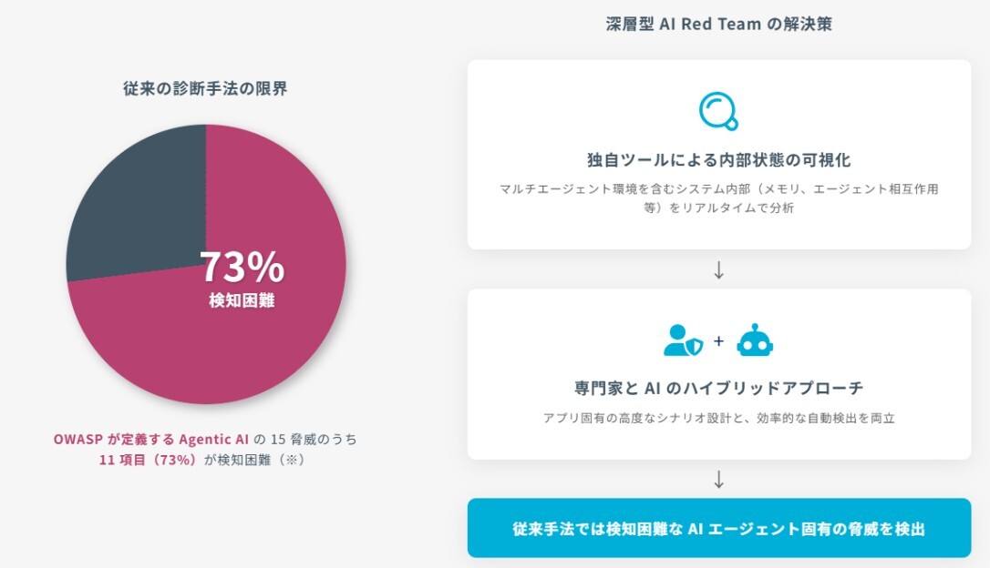 A.従来の AI Red Team はチャット画面の入出力など外部インターフェースを対象としたブラックボックステストでしたが、深層型 AI Red Team は独自ツール「ai-guard」により AI エージェントの内部状態(メモリ、推論プロセス、エージェント間通信等)を可視化して診断します。これにより、OWASP が定義する Agentic AI の 15 脅威すべてに対応可能となりました。
