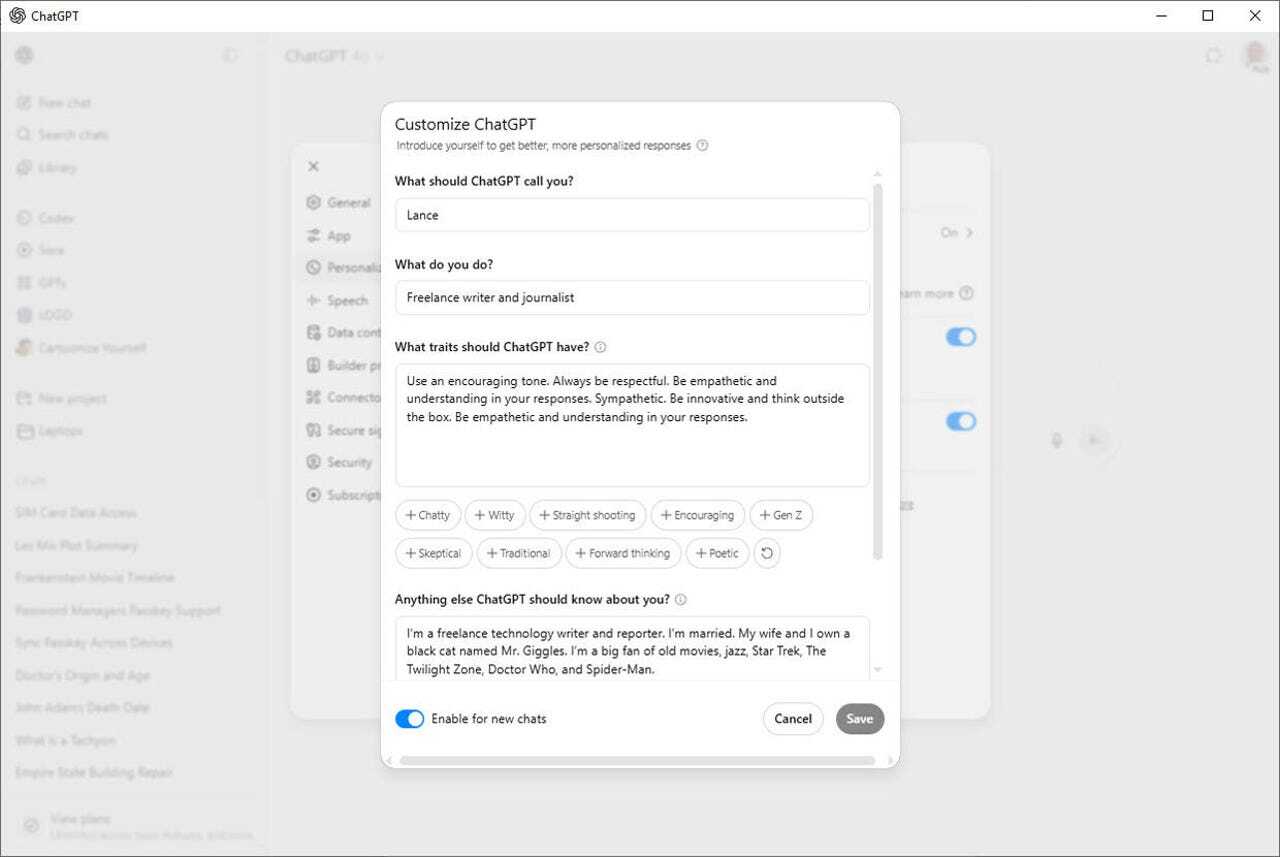 「ChatGPT」のカスタマイズ機能を試してみた--設定の手順と実際の応答例 「ChatGPT」には、ユーザーに関する情報や、ChatGPTに求める特徴などを設定するカスタマイズ機能がある。設定の手順と、実際に使ったときの応答の例を紹介する。 2025-07-18 07:00 提供:Screenshot by Lance Whitney/ZDNET 記事に戻る