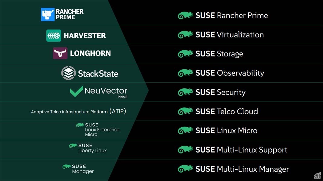SUSE、日本市場での事業戦略を強化--OSSでユーザー企業に選択肢を取り戻す SUSEソフトウエアソリューションズジャパンは9月18日、報道向けの説明会を開催し、独SUSEの最高経営責任者(CEO)であるダーク-ピーター・ヴァン・ルーウェン氏と、日本法人のカントリーマネージャーが事業戦略を明らかにした。 2025-09-19 15:50 製品名の整理状況。左側が旧称で、右が新しく整理された製品名となる 記事に戻る