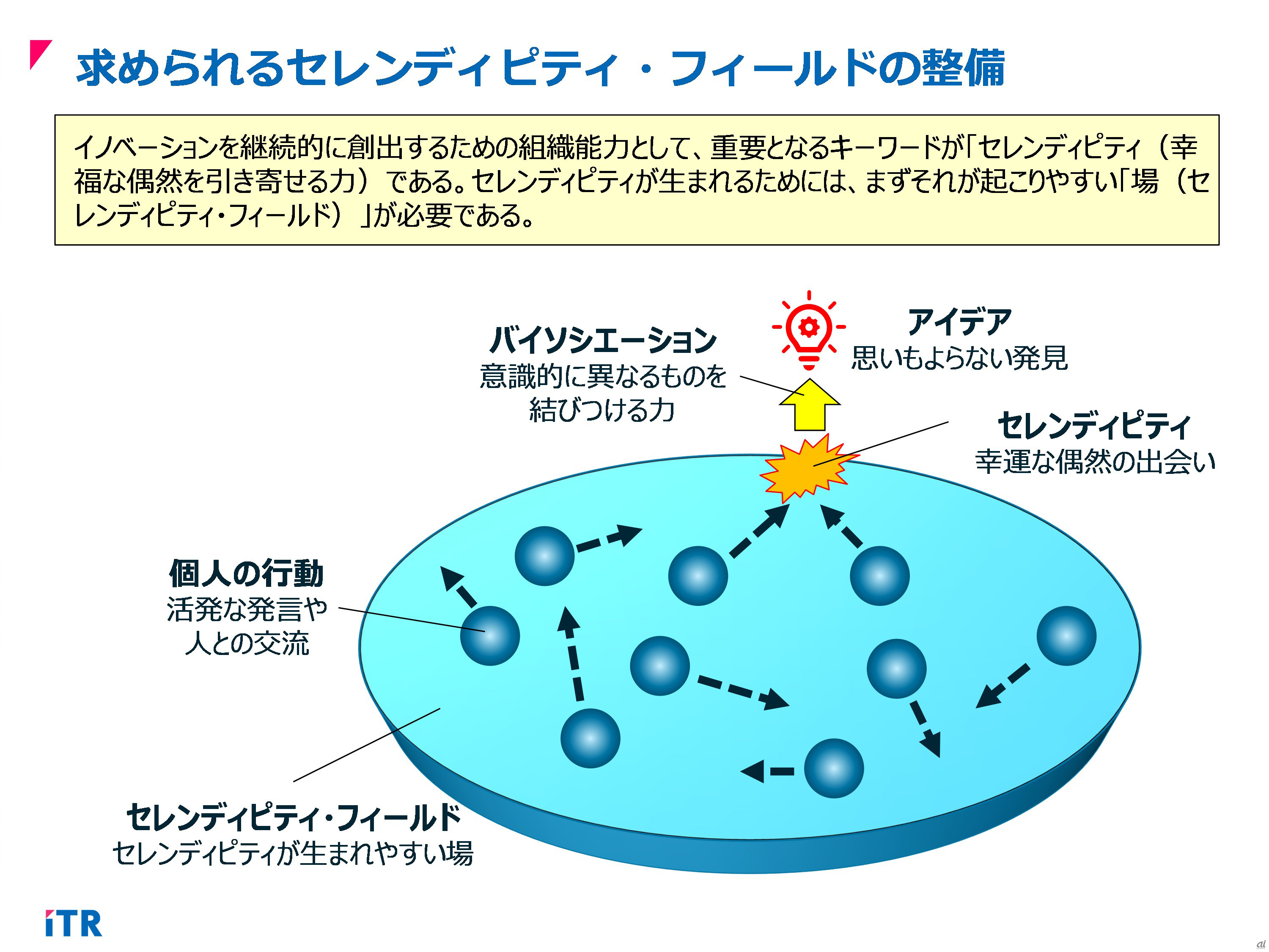 セレンディピティ・フィールドの整備--イノベーションを呼び起こす環境を作る イノベーションを継続的に創出するための組織能力として、重要となるキーワードが「セレンディピティ」です。イノベーションを創出するには、既知の要素を組み合わせることが有効ですが、それが起こりやすい「場(セレンディピティ・フィールド)」を備えることが不可欠です。 2026-02-18 07:00 図1.求められるセレンディピティ・フィールドの整備(出典:ITR) 記事に戻る