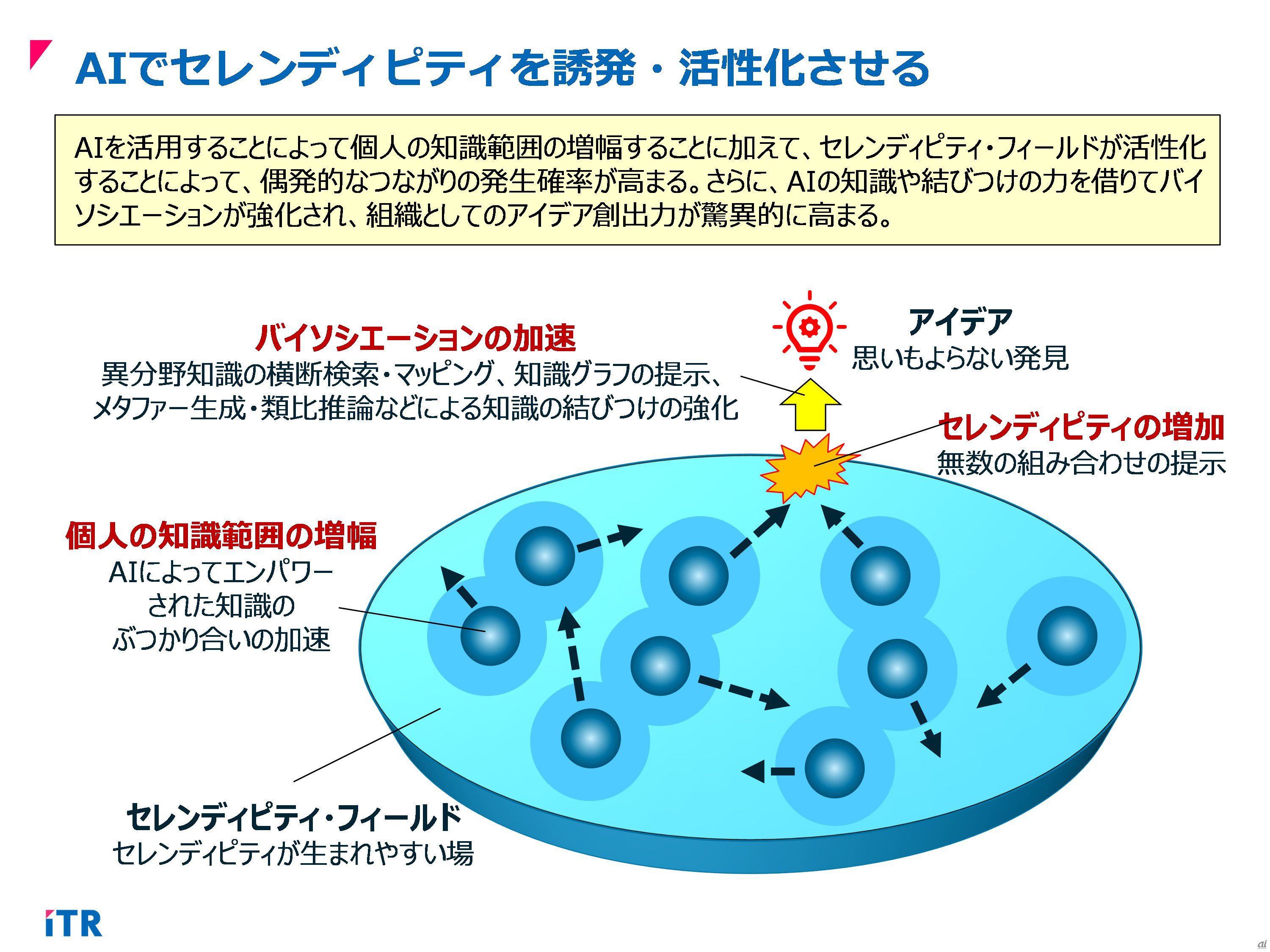 セレンディピティ・フィールドの整備--イノベーションを呼び起こす環境を作る イノベーションを継続的に創出するための組織能力として、重要となるキーワードが「セレンディピティ」です。イノベーションを創出するには、既知の要素を組み合わせることが有効ですが、それが起こりやすい「場(セレンディピティ・フィールド)」を備えることが不可欠です。 2026-02-18 07:00 図2.AIによるセレンディピティ・フィールドの活性化(出典:ITR) 記事に戻る