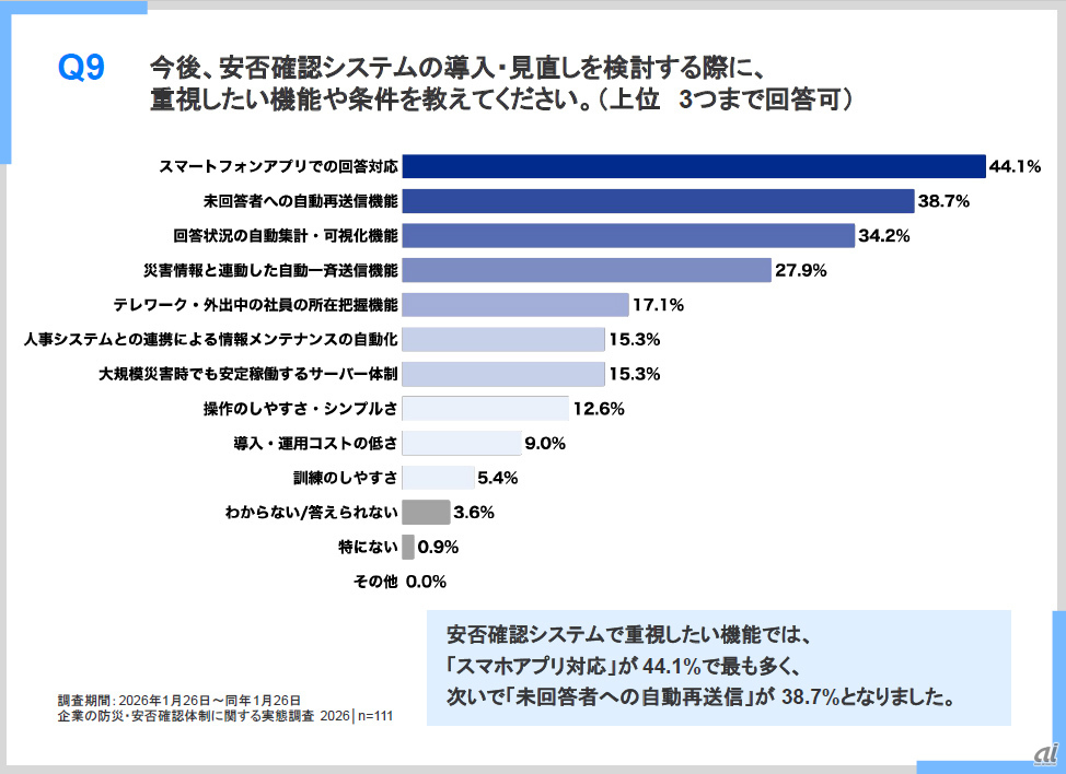 トヨクモ「企業の防災・安否確認体制に関する実態調査2026」を発表 トヨクモは、従業員100人以上の企業で事業継続計画(BCP)や安否確認業務に携わる担当者111人を対象に実施した「企業の防災・安否確認体制に関する実態調査2026」から、現在のリアルな実態が明らかになった。 2026-03-11 12:13 安否確認システムの導入・見直しを検討する際に、重視したい機能や条件 記事に戻る