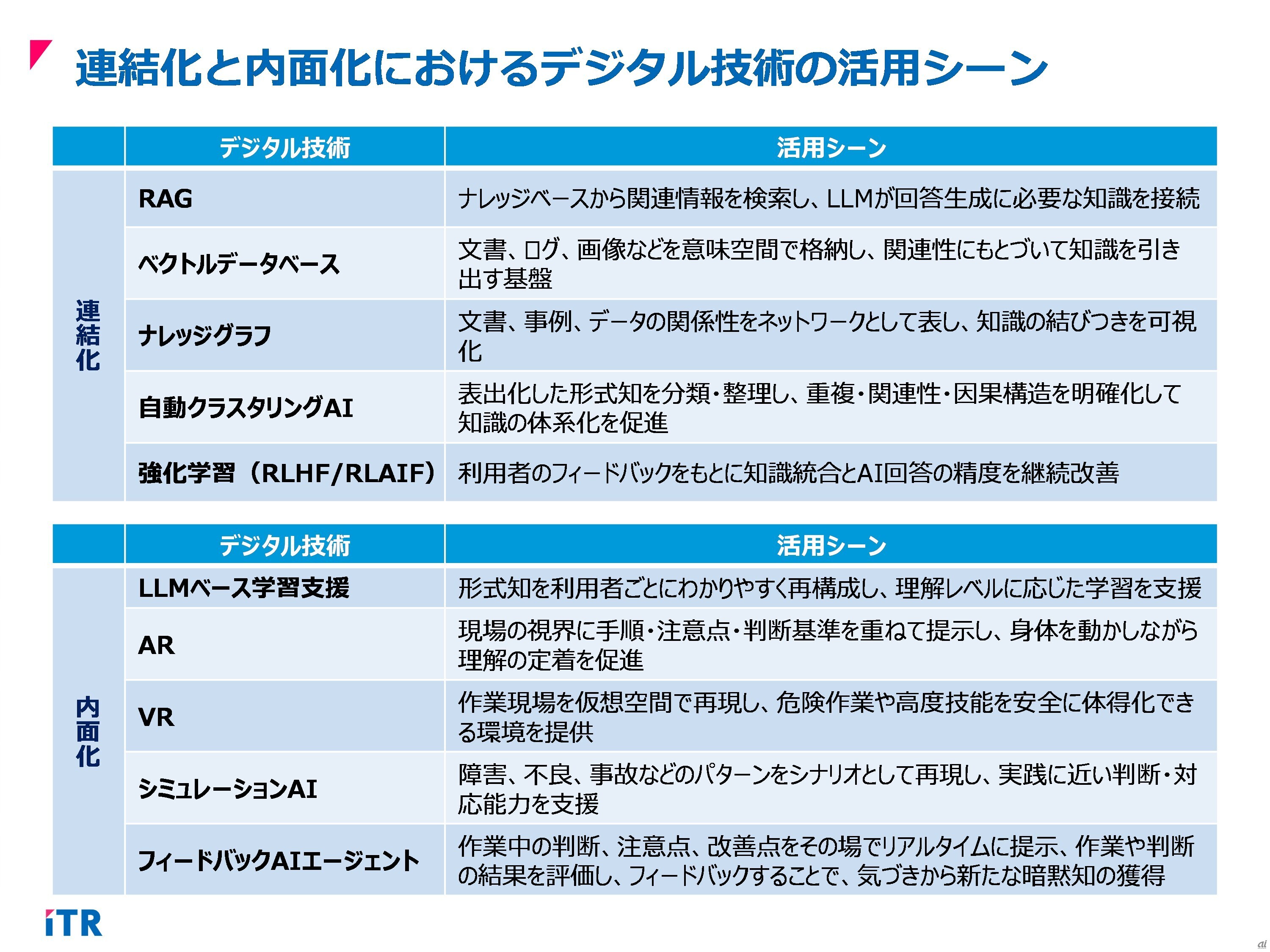 AIを活用した「知の循環」--個人の暗黙知を組織のナレッジに昇華するプロセス 組織内の情報や知識を共有・活用するためのプロセスや手法である「ナレッジマネジメント」は、長年取り組まれてきましたが、実際に効果を挙げている企業は多くありません。しかし、AIを中心とするデジタル技術の進化と普及によってその重要性が再認識され、新たなステージが切り開かれようとしています。 2026-04-15 07:00 図3.連結化と内面化におけるデジタル技術の活用シーン(出典:ITR) 記事に戻る