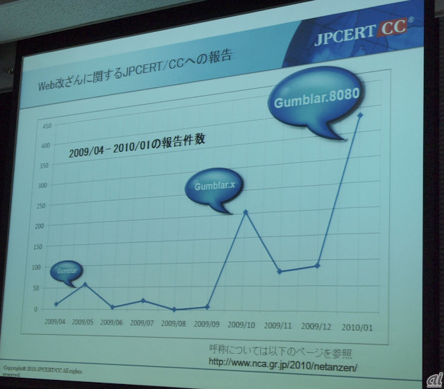 Web感染型マルウェア対策コミュニティが発足--FFRら国内ベンダーが集結 フォティーンフォティ技術研究所(FFR)が中心となって、Gumblarなどのウェブ感染型マルウェア対策を共同で行うコミュニティが結成された。各社がそれぞれの得意分野を持ち寄り、情報を連携させ対策強化を目指す。 2010-03-03 18:51 ウェブ改ざんの報告件数 記事に戻る