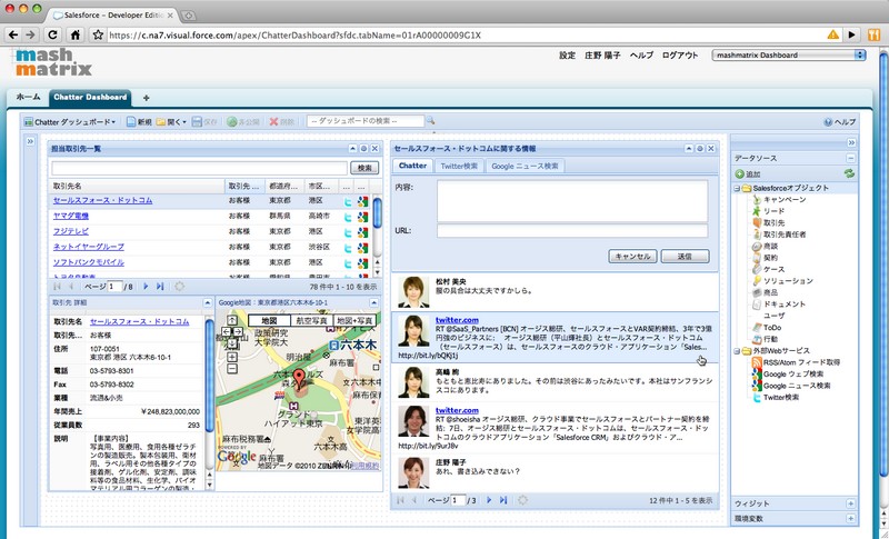 マッシュマトリックス、TwitterとSalesforce Chatterを連携させるマッシュアップ製品を発表 マッシュマトリックスはTwitterなどのソーシャルメディアとSalesforce Chatterを連携させるマッシュアップ製品「mashmatrix Widget for Salesforce Chatter」を発表した。 2010-04-13 07:00 記事に戻る