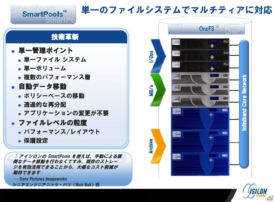 キャズムを超えた“スケールアウト2.0”でデータ大爆発に対応--アイシロン Isilon Systemsでディレクターを務めるNick Kirsch氏は、アーリーマジョリティに選ばれる“キャズムを超えた”唯一のNASストレージがIsilon製品だと豪語する。 2010-07-29 16:44 SmartPools(出典:アイシロン・システムズ) 記事に戻る