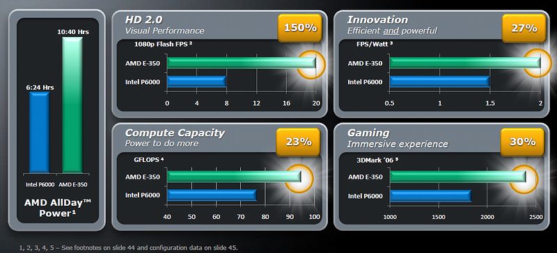 「これまでにないユーザー体験を」--AMD、低価格PC向けAPU新製品を発表 AMDは、1月6日に米国ラスベガスで開催される「2011 International CES」で、CPUとGPUを単一のチップ上に統合したAPU新製品「Brazos」(開発コードネーム)を発表する。これまで「Fusion」(開発コンセプト)と呼ばれていた同製品が、2011年より製品化されて市場に登場する。 2011-01-04 14:01 Eシリーズ「Zacate」と他社製品のパフォーマンス比較 記事に戻る