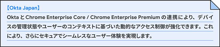 Okta との連携では、Chrome ブラウザが提供するユーザー認証情報、リスクスコア、デバイス情報などのシグナルを使って、リスクの高いユーザーや非準拠デバイスからの機密情報へのアクセスをChrome ブラウザレベルで制御する。先に少し触れたように、Chrome Enterprise Premium だけでも条件に基づくアクセス制御の機能は存在するが、より多様な情報を条件に用いてアクセス制御が可能になるというのが、この Okta 連携のメリットである。