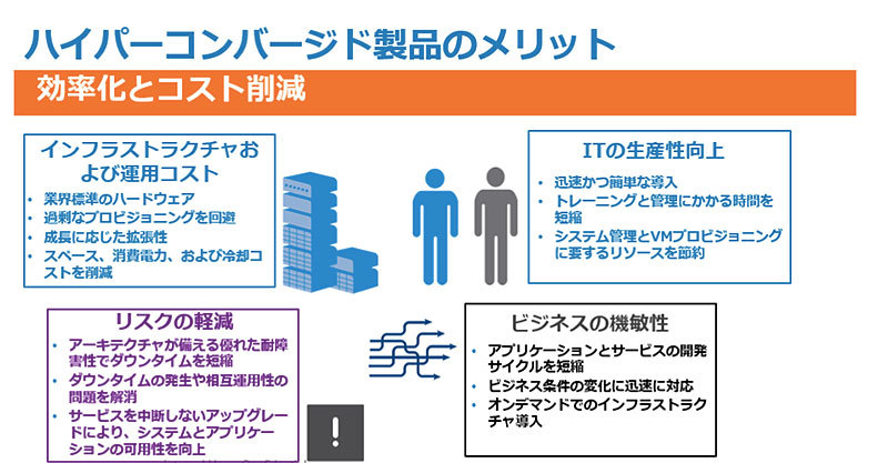 三邉氏:ユーザーがHCIを注目する理由の1つはそこですね。導入してから増やしていくことが前提としてある。増やしていく際には予測が困難なので必要なときにスムーズに増やせるか。例えば、最終的に2000台の仮想デスクトップの環境を構築するのですが、初期は200台からスタートしようとするとコスト的に見合いません。HCIなら当初200台からスタートして、コスト面でもリニアに増やすことができます。逆に、容量を増やす必要がなく、枯れた環境をお望みならSANストレージのほうが向いているとも言えます。