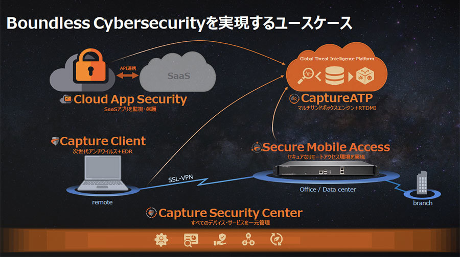 現実的なユースケースは、SSL VPNによるセキュアなリモートアクセスを実現する「Secure Mobile Access」(SMA)を中心に、エンドポイントを保護するCapture Client、SaaSへのアクセスを保護するCloud App Security(CAS)、これらすべてと連携して不審なファイルを検出するCapture ATPという4つのソリューションで構成されている。これにより、自宅のリモートワーカーのPCから、企業システム、SaaSに至るまで、環境全体を保護し、しかもCSCによって一元管理が行える。