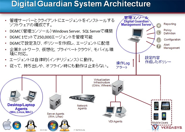「仮想環境で、あるファイルがマルウェアであると判断されたとすると、Digital Guardianは、その情報を受け取り、リストを作成し、エージェントに配信する。エンドポイント側からマルウェア感染が疑われる端末が見つかると、ネットワーク操作が制限され、警告が出て、その端末は、LANから切り離される」(大橋氏)という。