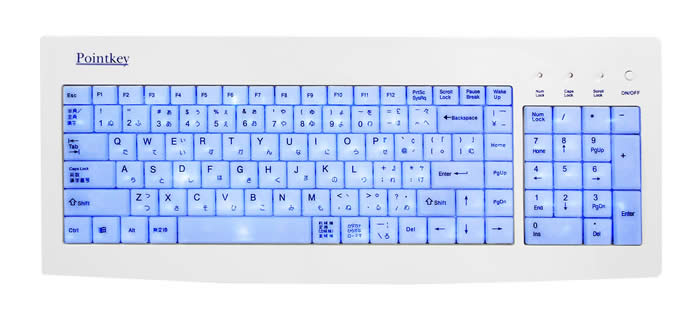 「Pointkey」は、PS/2対応のブルーLEDバックライトを搭載したキーボードと、USB対応の透明な光学式マウスを同梱した製品になります。キーボードにはアーク形状ボディーを採用し、光沢感のあるホワイトコーティングを施しています。バックライトには高感度ブルーLEDを搭載しており、LED平均寿命10,000時間と耐久性にも優れています。キーボードの利用状況に応じて、LEDバックライトのON/OFFを行えます。同梱している透明な光学式マウスには、キーボードに合わせてアーク形状ボディーを採用し、日本人の手のひらに合う小さめなサイズで作られています。