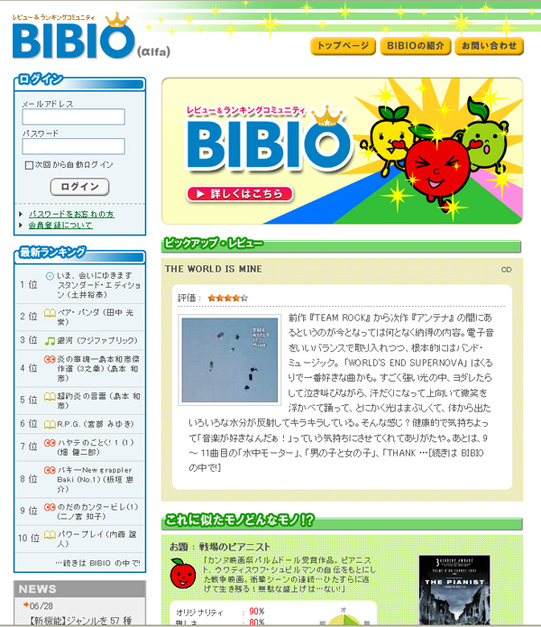 BIBIO は、ユーザー登録についてソーシャルネットワーキングの特徴のひとつである「招待制」を採用した、モノのレビューに特化したコミュニティ。(利用料は無料)対象カテゴリは (1)本、(2)マンガ、(3)CD、(4)DVD・ビデオ、(5)ゲーム。