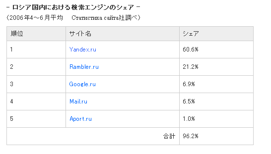 上位2位のみで80%以上のシェアを占めるロシア独自の検索エンジンシェア。