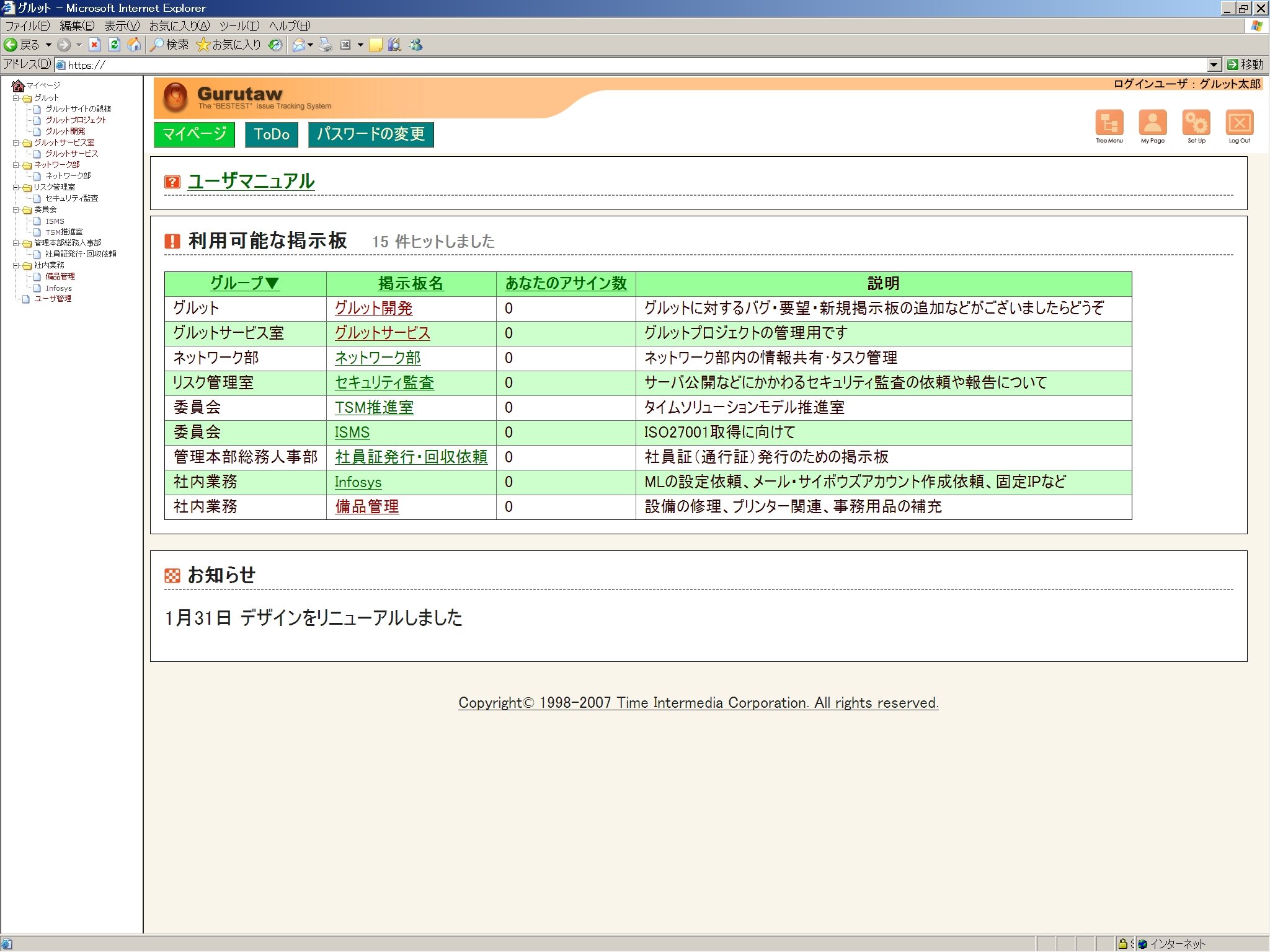 「グルット」の操作は、インターネット上の閲覧ソフト上でIDとパスワードを入力し、参加権限を与えられた個人用の掲示板を表示するだけです。掲示板は「定期券の申請」や「備品のリクエスト」、「社外とのプロジェクト」など、すでに管理者によって作られた、業務用の案件ごとに分かれています。掲示板は、参加権限の与えられた人だけが閲覧・記入を行なえます。掲示板とメールは連動していて、必要事項を掲示板に書き込むと、指定した関連部署または関係者に自動的にメールが配信されます。案件ごとに、「期限」、「状態」、「アサイン」、「ステータス」、「タイプ」、「カテゴリー」等の情報を付加することができ、「依頼」「対応中」「継続」「完了」といった作業の進捗状況の他、納期順や重要度順等にいつでも一覧管理できます。