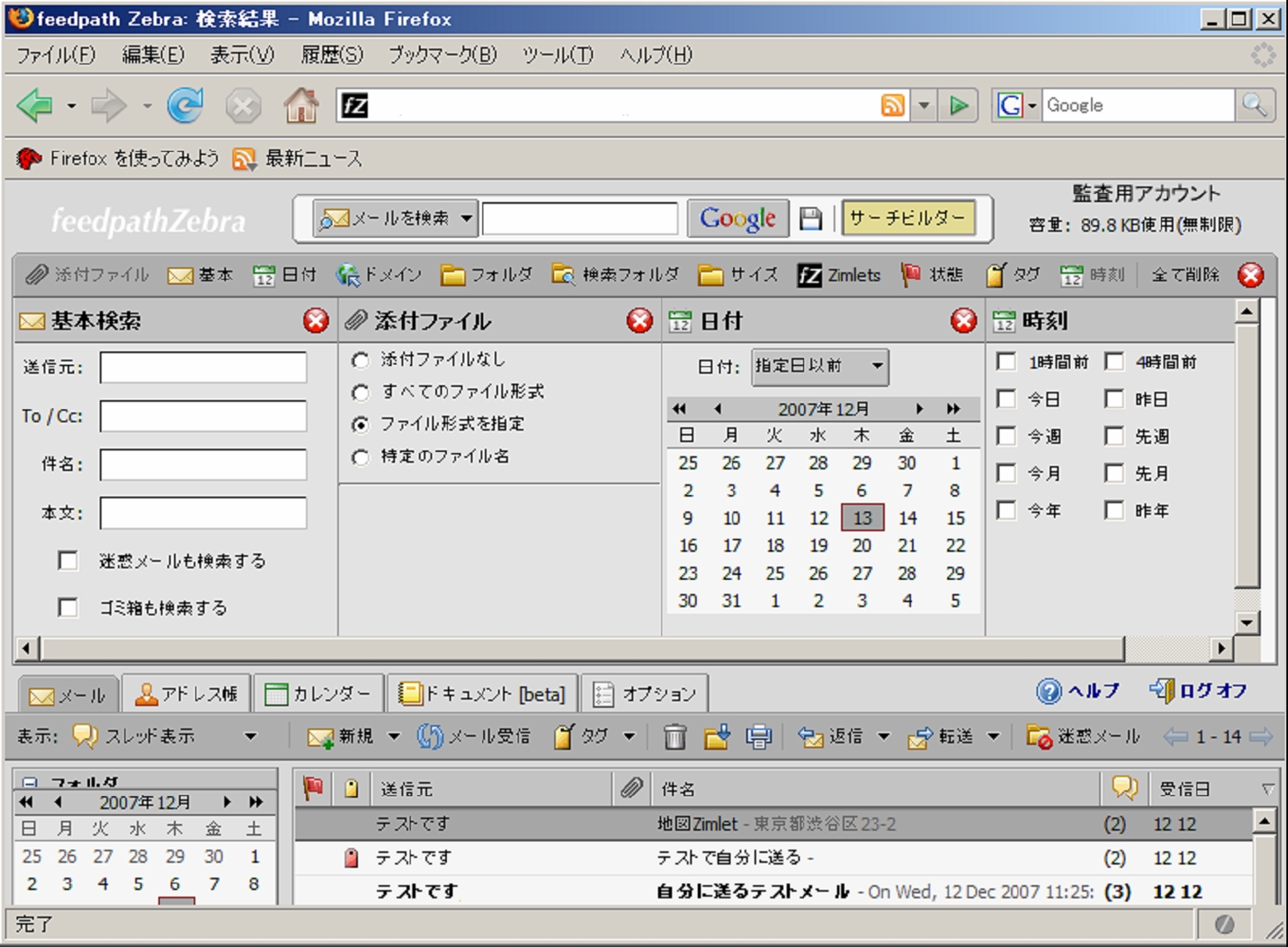 内部監査に必須となる機能を提供する有料オプションです。社員のPC端末やセンターサーバ等に散らばっているメールデータを当社サーバに一元化することで、情報管理者が監査当局等からの依頼に即座に対応し、全ての社内外のメールデータに瞬時にアクセスして、データの検索および抽出を可能とするオプションです。全ユーザーのメール容量と同じディスク容量スペースを別に確保し、管理者権限を持つユーザーにだけ、全送受信メールをWebクライアントで閲覧/検索(監査)可能になります。