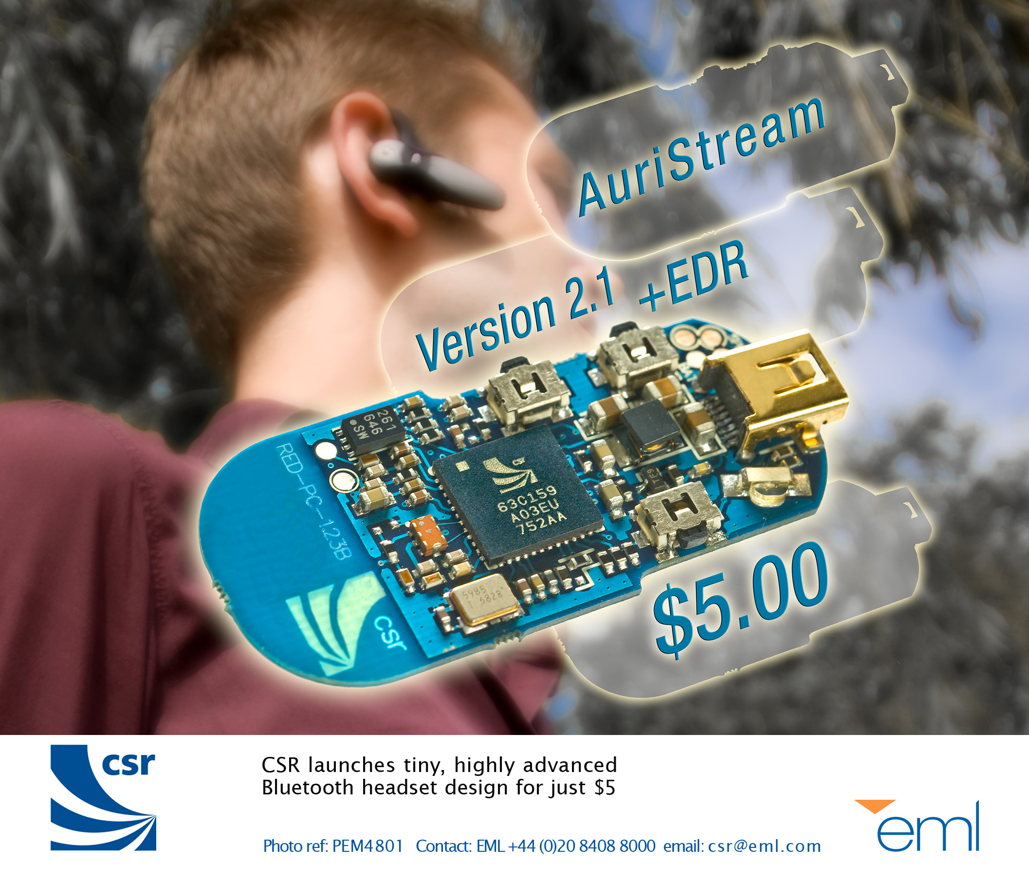 CSR は、本日、総電子部品コスト(eBOM)がわずか5ドルのBluetoothヘッドセット開発用リファレンスデザイン、「BlueVox2」を発表。BlueVox2は、ゼロコストのノイズ/エコー キャンセレーション機能と超低消費電力を特徴とする、世界で最も低コストの先進Bluetoothヘッドセット。BlueVox2は、固定電話並みの通話品質を実現するAuristreamの搭載、複数デバイスの同時ペアリング機能、Bluetoothバージョン2.1+EDRのサポートなど、世界初の数多くの特徴を有します。またヘッドセットの開発メーカーは、BlueVox2の超小型BGAパッケージ(4.5X5.5mm)を使用し、世界最小のBluetoothヘッドセットを開発することが可能。