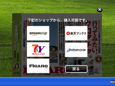 雑誌の購入は、amazon、楽天、セブンアンドワイ、Fujisan.co.jp、および出版社サイトを原則として用意しました。利用者は購入のためのボタンを押すと、その雑誌の取扱いのあるオンライン書店および出版社の販売サイトのアイコンが表示され、普段利用者が使っているオンライン書店を選んで購入ページに進むことができます。
