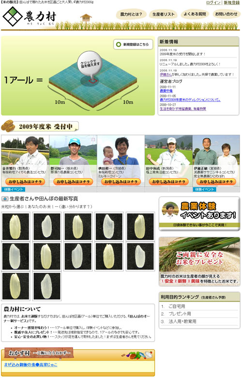 当社は、株式会社アエリア(本社:東京都港区、代表取締役:小林 祐介、以下「アエリア」)との共同事業『農力村(のうりょくむら)』( (リンク ») )におきまして、本日より2009年度に収穫されるお米の販売を開始いたしましたので、お知らせいたします。