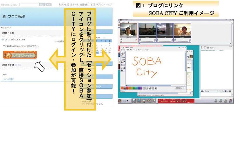 SOBA CITYは、SOBAプロジェクトが2006年3月にサービスを開始した完全無料のテレビ会議・Web会議システムです。多人数で映像と音声、チャット・ホワイトボード・Webブラウザ・アプリケーション共有機能を使って情報共有が可能です。現在1万人を超えるユーザがおり、各種コミュニティや企業内の会議でのリアルタイムコミュニケーションにご利用いただいています。