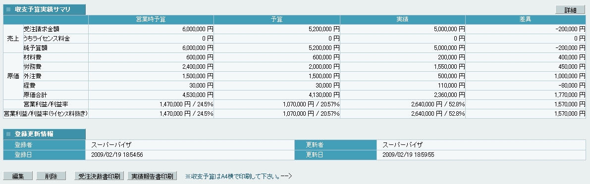 ・営業時予算、実行予算、実績、差異のリアルタイム表示機能 (下図参照)