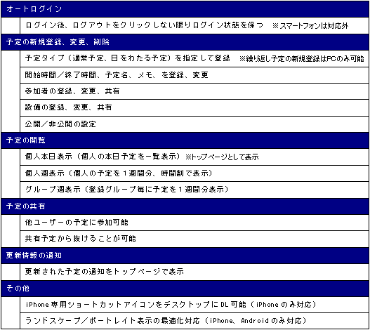 「feedpath Calendar」は、スケジュール共有をシンプル、スリム、スマートにする無償グループカレンダーサービスとして、10名以下のビジネスユーザーに提供しています。今回、お客様の利便性の向上と利用環境の拡大を図るため、国内3キャリア(docomo、au、SoftBank の3G世代携帯端末)に対応し、同時にiPhone、Android、BlackBerry のスマートフォン端末からもご利用可能となります。PCからのご利用と同様に、モバイル端末でも「シンプル、スリム、スマート」をコンセプトに、画面の切り替えやデータ表示を、1クリックで実現するシンプルな画面デザインを採用し、スマートフォン端末は各仕様に併せてインターフェースを最適化しています。