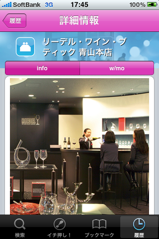 リーデル社では、自社製品の良さをお客様に体験・理解していただくために、実際に異なる形状のグラスで様々なワインを飲み比べる“グラス・テイスティング”を行っています。今回、より多くのお客様に‘グラス・テイスティング’を体験していただく新たな情報発信・マーケティングの手段を模索した結果、GPSに連動して情報を発信できるメディア※であるiPhoneアプリ【ウィズモ】において、情報を掲載・発信する運びとなりました。