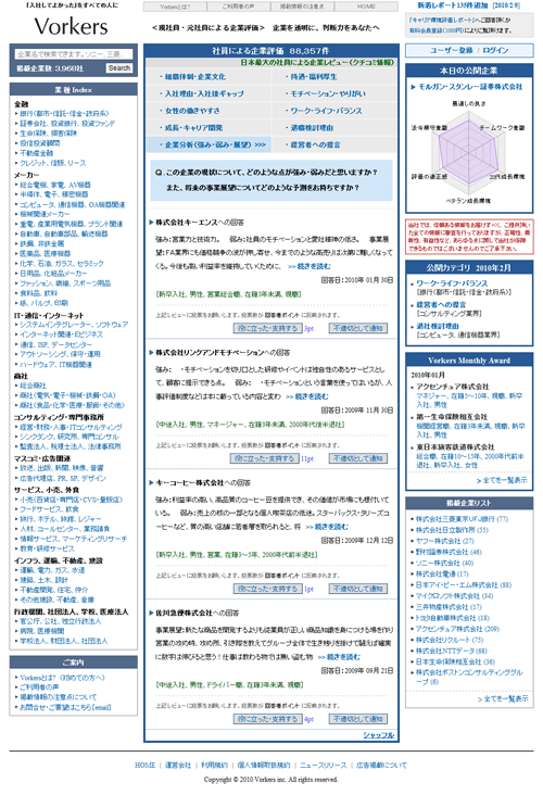 2007年6月設立。ビジネスパーソンからWEB上での「キャリア環境評価アンケート」を通じて、現在の所属企業、もしくは、過去に在籍した企業のキャリア環境に関する評価やコメントを集積したWEBサイト『Vorkers』を運営。