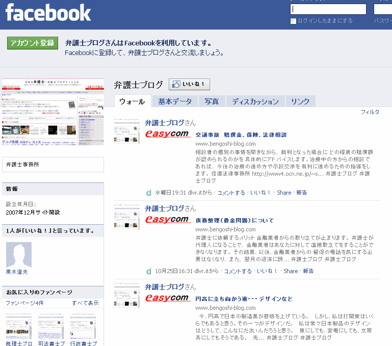 同社によると、「弁護士ブログのフェイスブックも先週開設済みで、ブログのRSS配信で掲載しております」