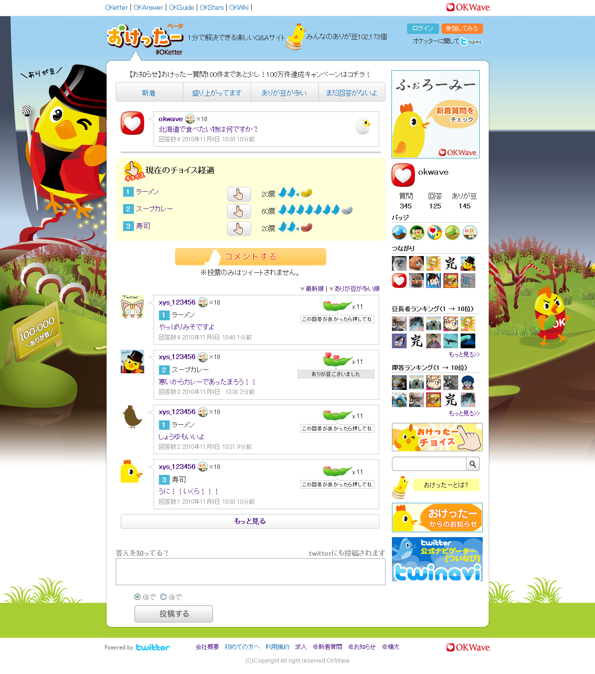 『おけったー」はTwitterの仕組み(API)を利用したQ&Aサイトです。Twitterのアカウントを取得することで、 『おけったー』から誰でも気軽に質問や回答を投稿できます。『おけったー』から投稿した質問、回答は『おけったー』内のみならず利用者の「Twitter」ページにもURLと共に反映されるため、質問、回答をいつでも確認することができます。Twitter利用者へ疑問の発信が気軽にできることで、「1分で解決できる」Q&Aサイトを目指します。