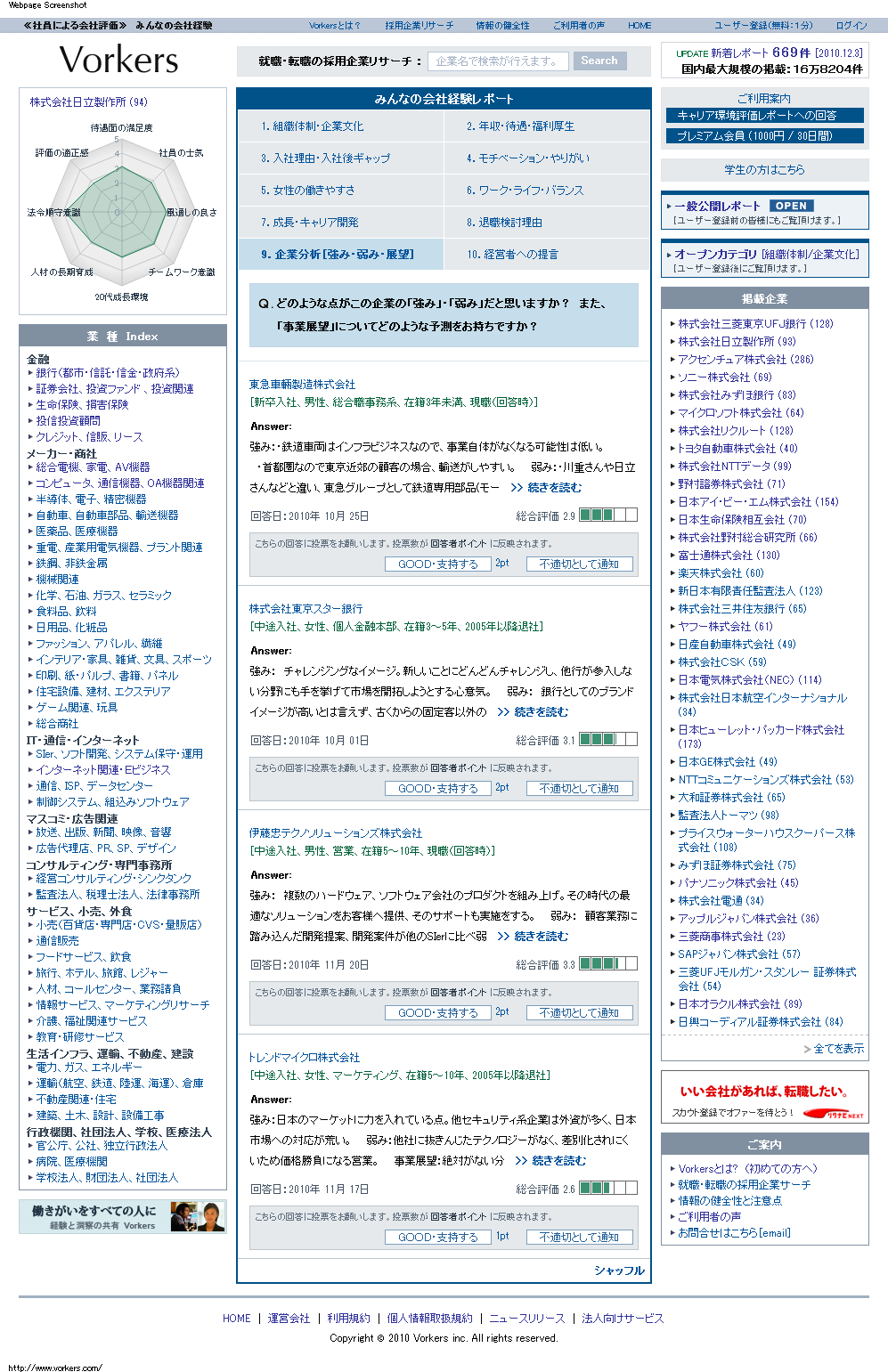 2007年6月設立。ビジネスパーソンからWEB上での「在籍企業評価レポート」を通じて、現在の在籍企業、もしくは、過去に在籍した企業の職場環境に関する評価やレビューを集積したWEBサイト『Vorkers』を運営。