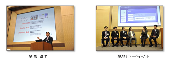 第2回セミナーの第1部では、株式会社セールスフォース・ドットコム(以下、セールスフォース) 代表取締役社長 宇陀 栄次(うだ えいじ)氏に「セールスフォース・ドットコムの統合型社会貢献モデルについて」と題し、トップのコミットメントのもと、創業時から同社のDNAに組み込まれている「1%モデル」*に基づいた社会貢献活動への取り組みとその意義、企業の価値と社会的責任についてご講演いただきました。続いて、セールスフォース・ドットコム ファンデーション マネージャー 遠藤 理恵氏より「ビジネスと有機する社会貢献活動を可能にした『1%モデル』と実例紹介」と題し、「1%モデル」の具体的な活動実績を中心に、NPOとの協働による障害者支援やパートナープログラムについてお話しいただきました。
