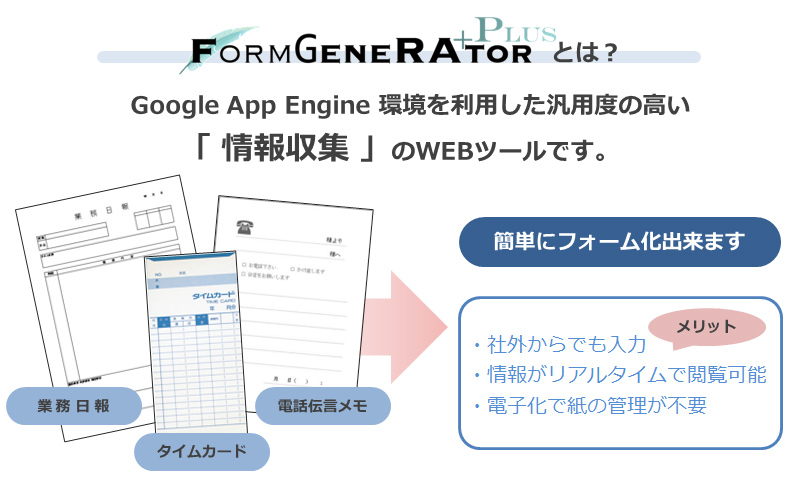 GoogleAppEngine(GAE)環境下で稼働するシステムなので、サーバー環境の初期コストやランニングコストもゼロで、自社独自のフォーム作成環境が構築できます。フォームの作成は入力項目の設定を行うだけなので、特別なWebの知識は必要ありません。