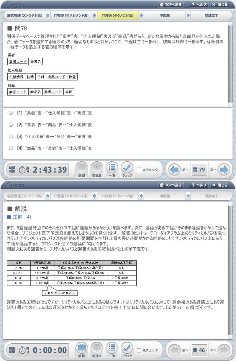 今回「動学.tv」に公開したコンテンツ「ITパスポート試験対策教材・問題集 平成23年度春期試験対策」は、情報技術の基礎知識を測るITパスポート試験の、資格取得を目指す人を対象としたコンテンツです。同コンテンツは「動学.tv」で公開している大半の講座とは異なり、動画教材ではありません。Web上で動くFlashのプログラムとなっており、動画や文書ファイルでの教材配信とは違いインタラクティビティを有しています。基本的には、画面に従って問題集を解いていく形式ですが、問題集には「問題学習」と「模擬試験」という2つのモードが用意されており、それぞれ学習方法が異なります。まず「問題学習」は、過去問題と予想問題を合わせた全700問を全て学習できるモードで、問題を解きながら解説ページもその場で見ることができます。「模擬試験」モードでは、実際の試験を想定して制限時間内に回答していくモードとなっています。どちらのモードでも100題ずつ出題され、内容をランダムにすることも可能です。「問題学習」でじっくり学習して、自信が付いてきたら「模擬試験」にチャレンジする、という順で学習するのが効果的です。そしてその採点結果によって苦手傾向を洗い出していけば、徐々に正解率が上がっていくことでしょう。