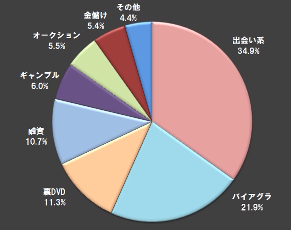 2010年11月17日から2011年6月16日までの7ヶ月間に収集した日本語で書かれたスパムメールを、G Data Softwareがトピック別に集計したところ、以下のような比率となりました。なお、ここで言う「スパム」とは、営利目的で一方的に送られてくるメールのことで、「迷惑」かどうかがあいまいなものは省き、明らかに「迷惑」な内容であるものを指します。