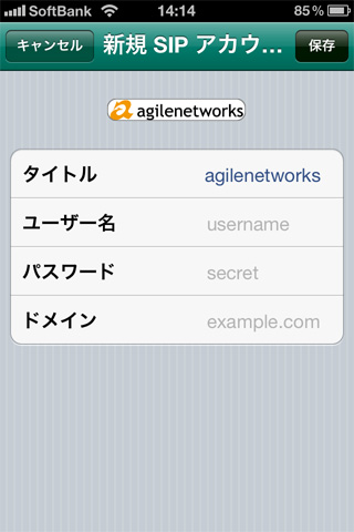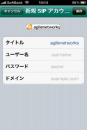 「詳細設定」→「SIPアカウント」右上にある「+」→「新規SIPアカウント」Popularity→「agilenetworks」へとすすんでいきます。