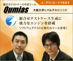 ソフトウェアテストの専門会社であるバルテス株式会社(代表取締役社長:田中 真史、本社:大阪市中央区、以下バルテス)と、大阪大学大学院 情報科学研究科 土屋達弘 教授(以下、大阪大学・土屋教授)による共同研究の 成果として組合せテストケース生成ツール「Qumias」(クミアス)が完成しました。